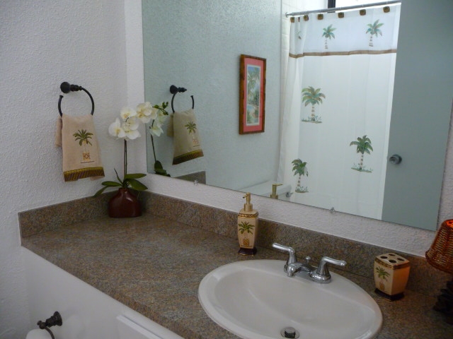 VISIONS OF PALM TREES! Second Bedroom has two twin beds (that can be arranged together as King size upon request),dresser, A/C, ceiling fan and en-suite nicely appointed full bathroom with tub/shower.